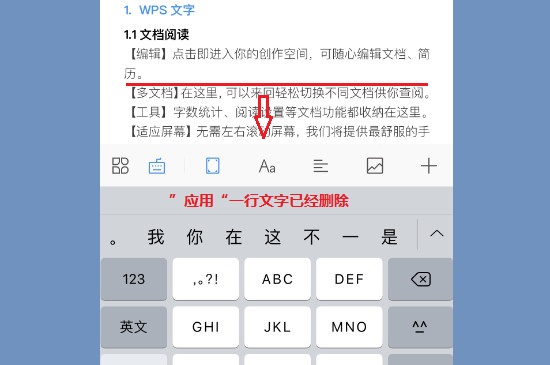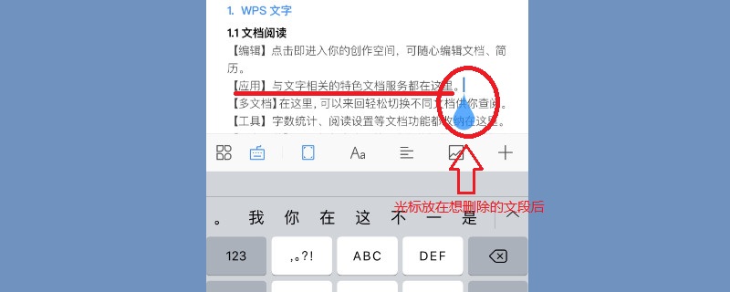首先打开手机版word,又称“WPS Office”。打开软件后将要删除的文段找好,可以先调整成一整行,这样删除的时候更方便。如图,要删除文段“应用”,点击一下文段的最后,可以看到一个蓝色的水滴状的光标,可以移动光标到尾端。