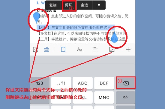 点两下文段之后,会看到弹出来的编辑框,此时光标从一个变成两个,移动前一个光标到文段的最前方,使要删除的文段处于两个光标中间,同时还被蓝色框选中。确定后有两个方式删除:一是按图中①处所展示的后退键,二是②处的剪切键。
