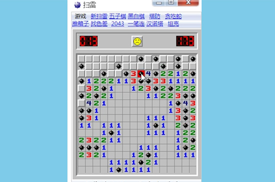 鼠标左键任意点击翻开格子,若为雷,则游戏结束。若为数字,则可以继续点击。若被翻开的数字为1,则说明被的翻开格子周围有1个雷,若为2,则周围有2个雷,依次类推。若预测任意格子为类,可用鼠标右键标记,可以避免误操作点到雷。