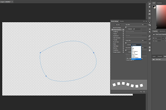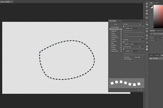 使用“钢笔”工具绘制一段路径,选中“画笔”工具,设置画笔的形状为方块。然后在路径面板中选中“工作路径”点击“加载路径作为选区”,然后点击“描边路径”,这样就可以绘制一段虚线。