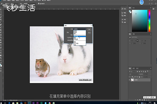 3、填充菜单中选择内容识别,再点击确定去掉水印,再按快捷键“CTRL+D”取消选区。