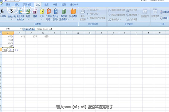 2、在求和的单元格点击,输入=sum(a1:a4)按回车就完成了,a1和a4是指求和的区间。