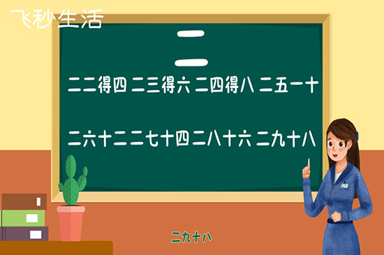 关于二的乘法口诀有二二得四、二三得六、二四得八、二五一十、二六十二、二七十四、二八十六、二九十八。关于三的乘法口诀有三三得九、三四十二、三五十五、三六十八、三七二十一、三八二十四、三九二十七。